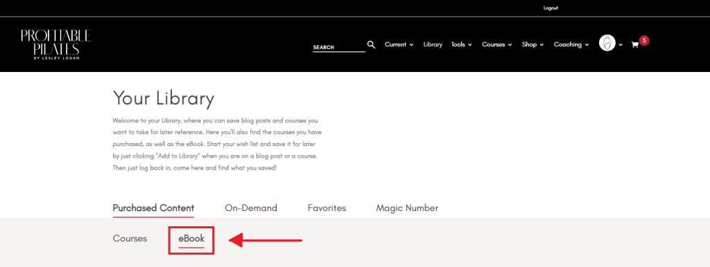 How to access Profitable Pilates eBook? 1. Log in to your Profitable Pilates account https://profitablepilates.com/login/ 2. Go to ‘Library’ at the top menu 3. Click ‘eBook’ to read your copy If you have any questions, please contact us.